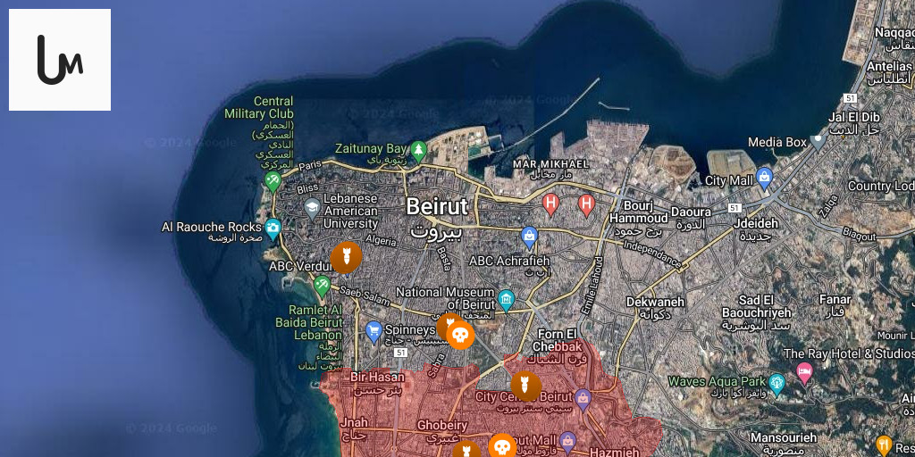 Areas targeted by recent Israeli airstrikes include: Al-Maamoura, Galerie Semaan, and Al-Mushrifiyah.