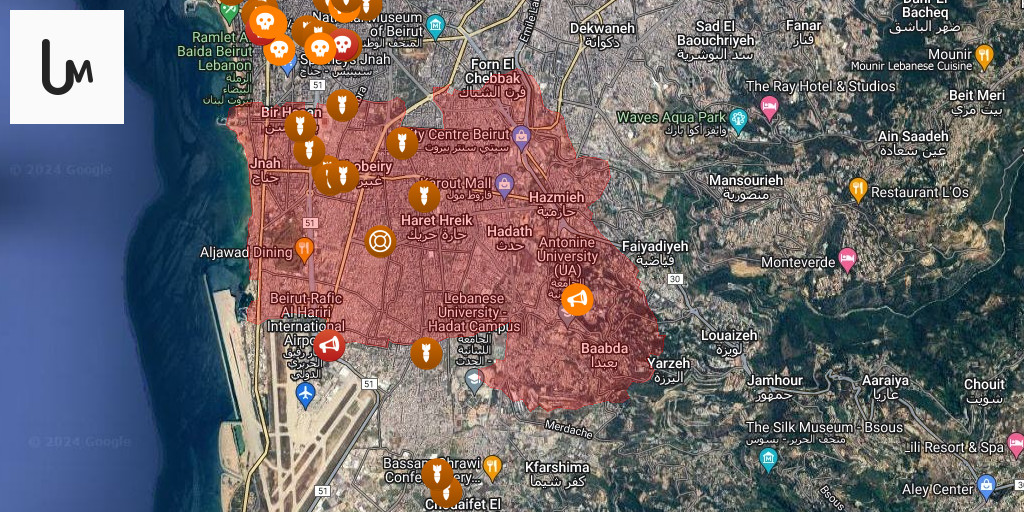 The series of Israeli raids on Beirut and its surroundings targeted: Bir Hassan, Al-Rahab, Hayy al-Salloum, Al-Manara, Ain al-Mreisseh, Corniche al-Mazraa, Musaytibeh, Al-Basta, Choueifat, Aramoun, Al-Bayader, Kafrhoun, Ain al-Tineh, Bshamoun, and Al Mdars